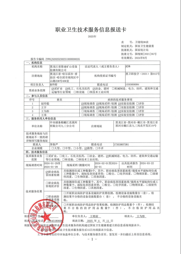 中央儲(chǔ)備糧嫩江直屬庫(kù)有限公司九三分公司職業(yè)病危害定期檢測(cè)